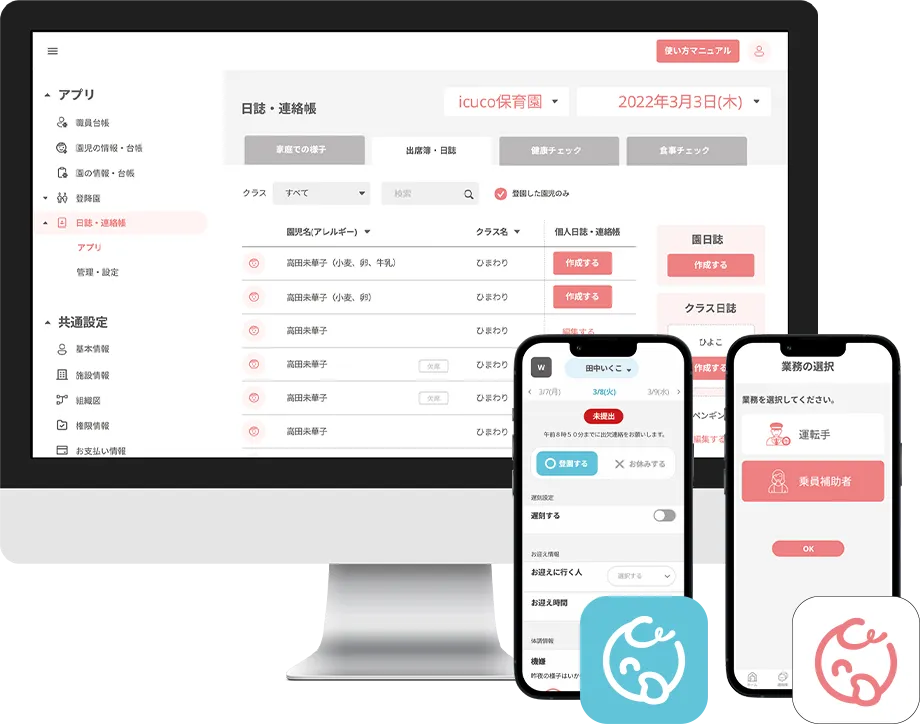 icuco®bookは、保育士の事務作業や、保育施設を運営する管理業務を、トータルで効率化する保育業務支援プラットフォームです。