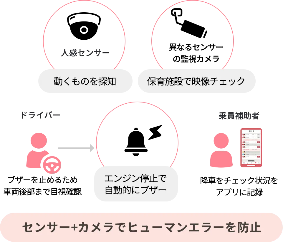エンジン停止後バス後部まで行き、安全装置を操作しなければ警報が発動。さらに、車内で動きがあると検知する人感センサーで子どもの置き去りを徹底的に防ぎます。